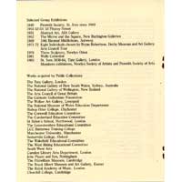 Click on image to enlarge List of works Bronze 1. Solaris. 1968. Bronze. 15ins (38cms). Ed 0/7. 2. Zennor. 1969. Bronze. 29ins (74cms). Ed 7/7. 3. Gurnic. 1970. Bronze. 9ins (23cms). Ed 4/6. 4. Dawna. 1970. Bronze. 5ins (13cms). Ed 7/7. 5. Polhue. 1970. Bronze. 4ins (10cms). Ed 5/6. 6. St. Merryn. 1971. Bronze. 13ins (33cms). Ed 7/7. 7. Trew. 1974. Bronze. 5ins (13cms). Ed 6/9. 8. Paphos. 1974. Bronze. 11ins (28cms). Ed 4/7. 9. Peninnis. 1979. Bronze. 3ins (8cms). Ed 4/9. 10. Winnow. 1975. Bronze. 19cms (48cms). Ed 5/5. 11. Veryan. 1975. Bronze. 17ins (43cms). Ed 7/7. 12. Carvean. 1975. Bronze. 6x4ins (15x10cms). Ed 5/7. 13. Pelyn. 1975. Bronze. 8ins (20cms). Ed 5/7. 14. Sennen. 1977. Bronze. 4x5ins (10x13cms). Ed 7/7. 15. Clodgy. 1979. Bronze. 32ins (81cms). Ed 4/7. 16. Trebah. 1983. Bronze. 4x3ins (10x8cms). Ed 4/7. 17. St. Eval. 1984. Bronze. 9ins (23cms). Ed 2/7. 18. Ganill. 1985. Bronze. 12x6ins (30x15cms). Ed 1/7. 19. Gweal. 1986. Bronze. 8x6ins (20x15cms). Ed 1/7. Slate 20. Helvelan. 1974. Honister Slate. 8ins (20cms). Unique 21. Endoc.1978. Delabole Slate. 28ins (71cms). Unique 22. Tresco. 1984. Delabole Slate. 22x18ins (56x46cms). Unique 23. Rinsey. 1984. Nebrocena Marble. 20ins (51cms). Unique 24. Zennor Head. 1985. Delabole Slate. 22x28ins (56x71cms). Unique Wood 25. Porthgwarra. 1976. Guarea. 46ins (117cms). Unique 26. Bodrean. 1985. Lignum vitae. 24ins (60cms). Unique 27. Roseveor. 1985. Yew. 22ins (56cms). Unique Reliefs 28. Circle and Five Lines. 1960. Slate and Bronze. 24x21ins (60x51cms). Unique 29. Relief No. 11. 1961. Slate and Bronze. 22x6ins (56x15cms). Unique 30. Constabba. 1966. Slate and Bronze. 27x10ins (69x25cms). Unique |