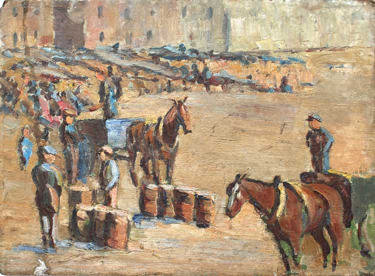 Horses on the Beach. Unsigned. 1938. Oil on Board. Unique. 35x27cms