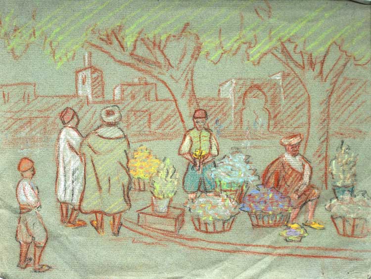 North African Market. Unsigned. 1935. Pastel on Paper. Unique. 31x23cms