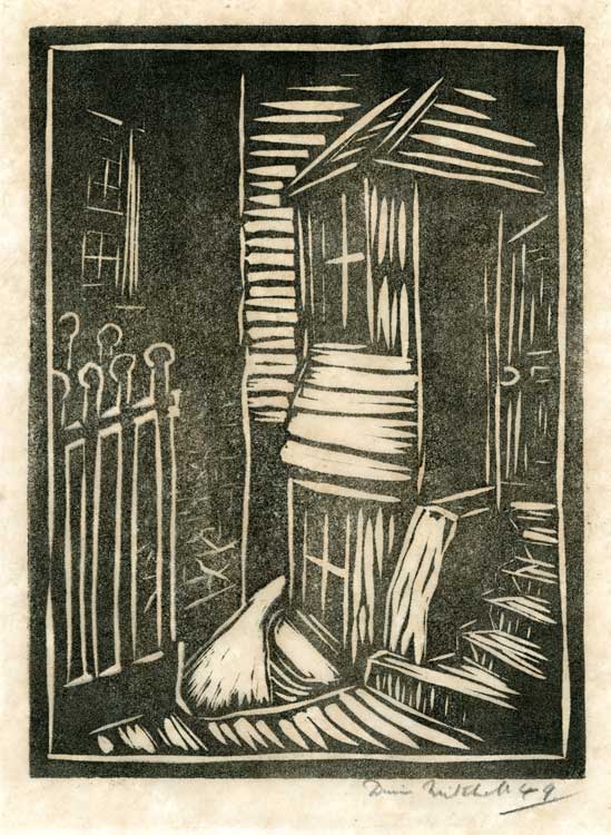 Between the Cottages. 1949. Linocut print. Unknown edition size. 11.5x15.5cms (approx)